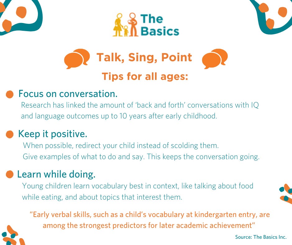 “Talk, Sing, Point” seems simplistic, yet the implications are HUGE. The non-profit LENA invented the ‘talk pedometer’ that was used in the research that linked conversational turns to a range of positive cognitive impacts. Head over to their page to learn more.